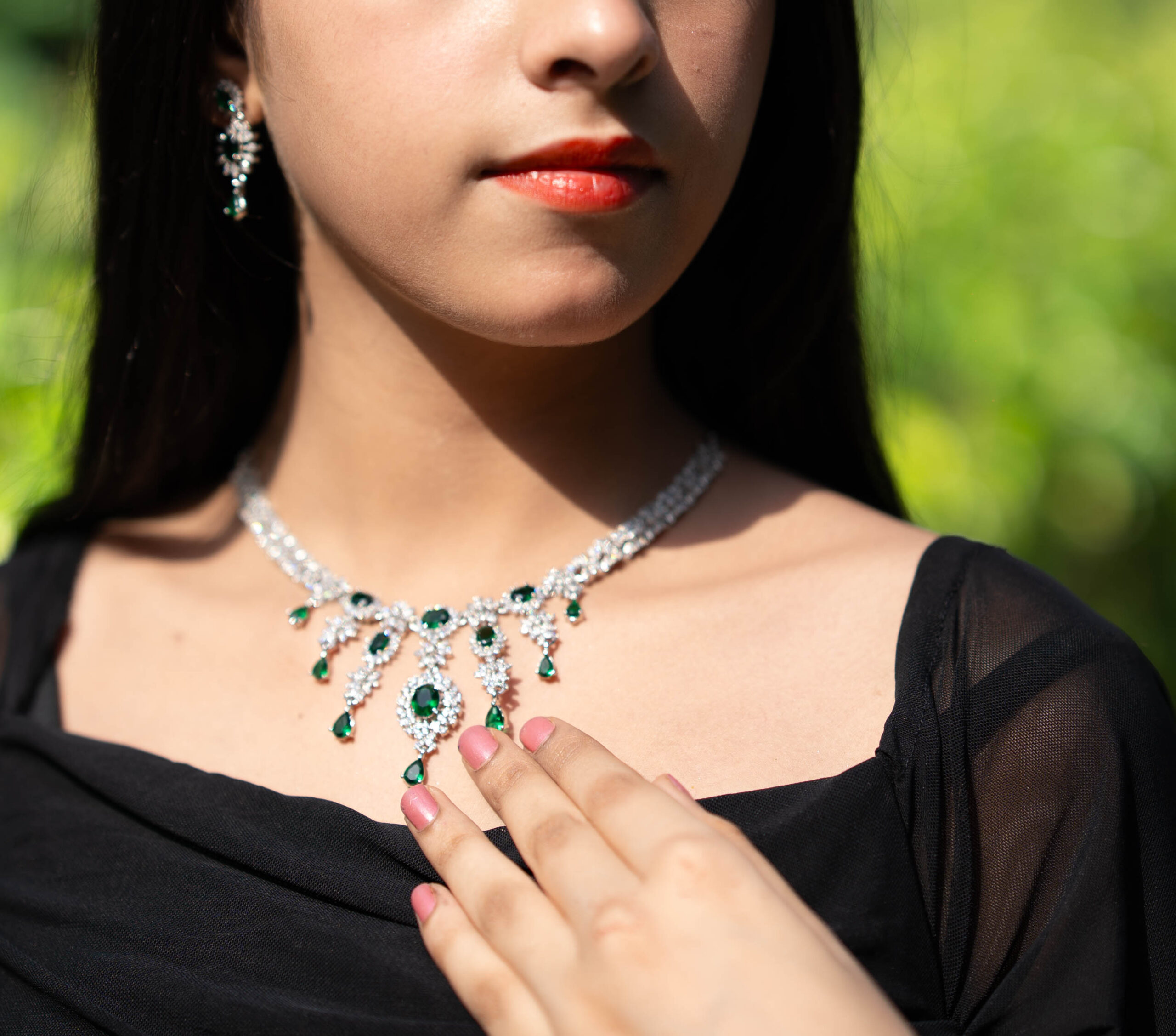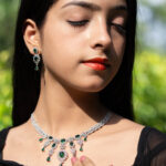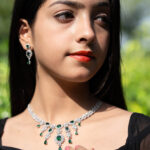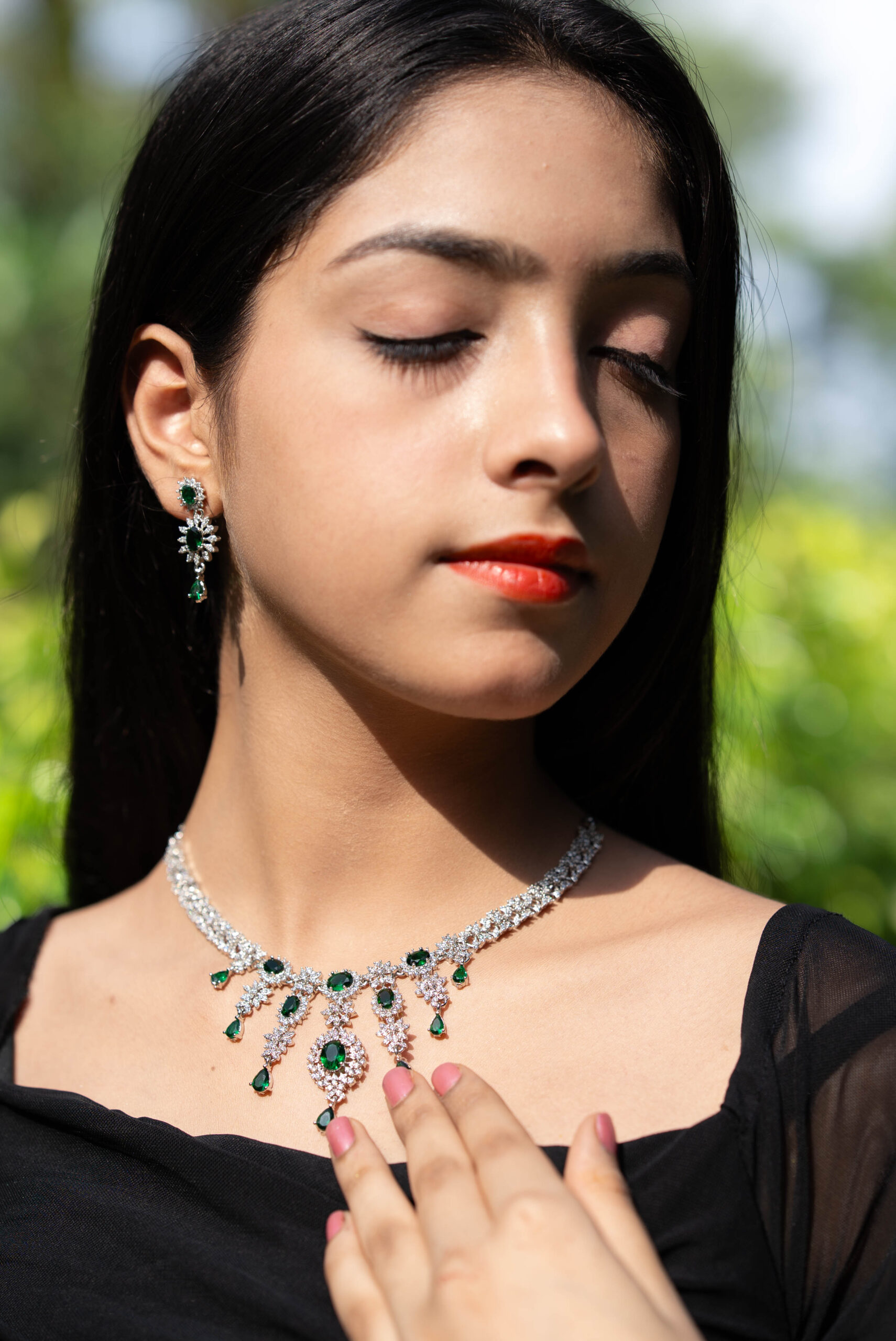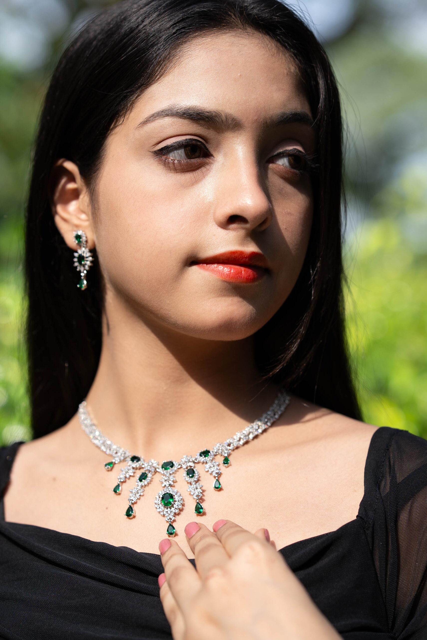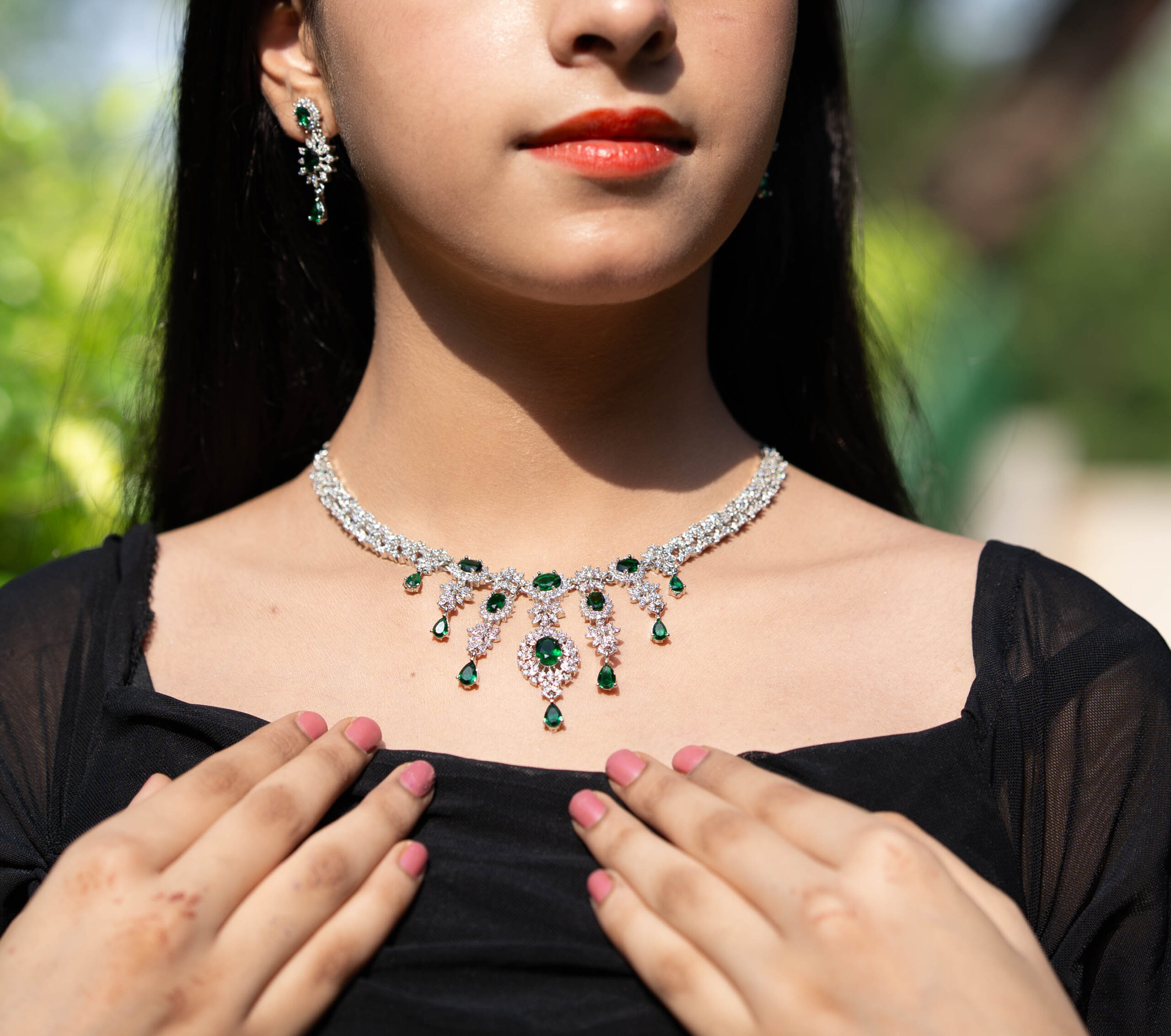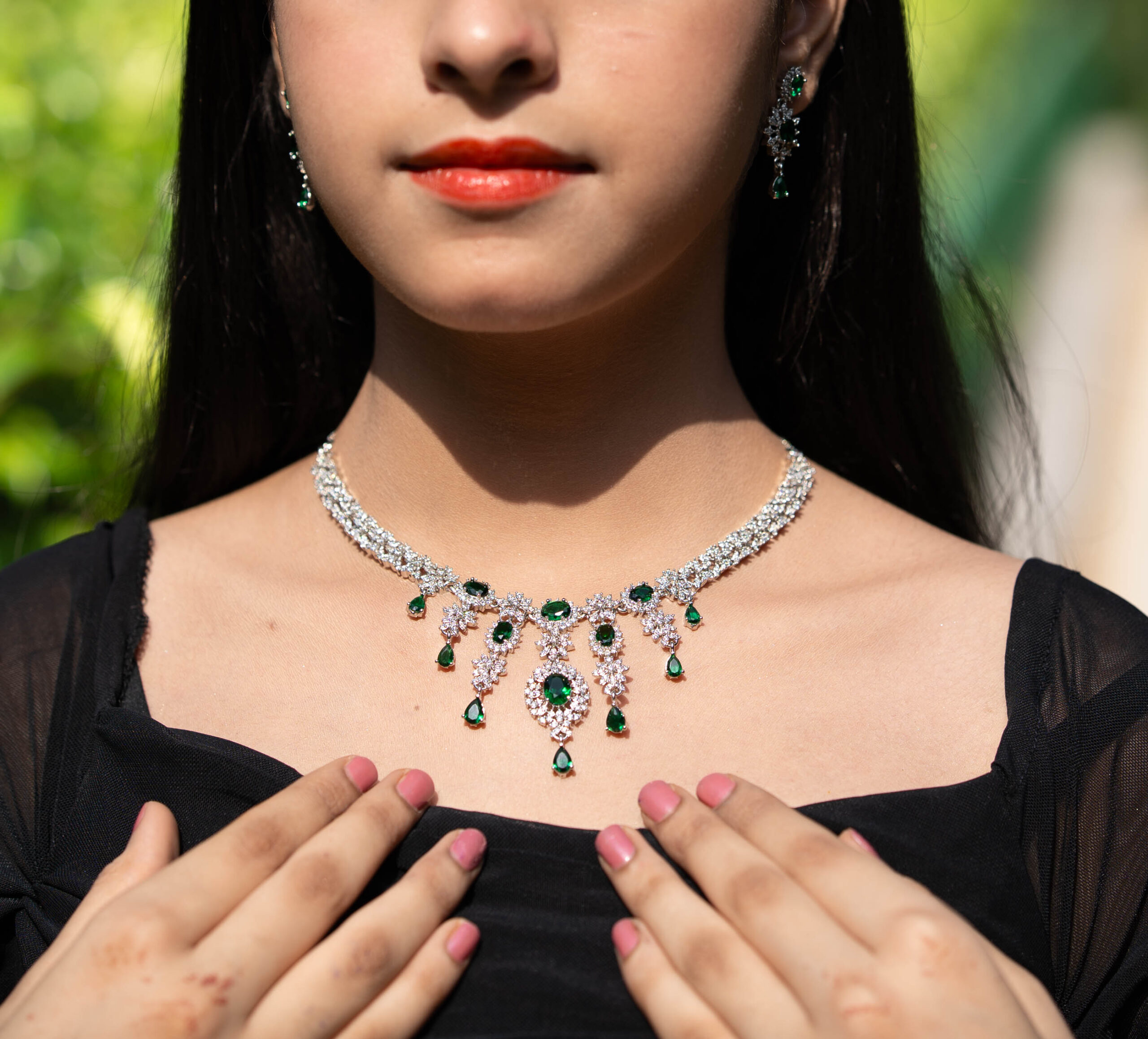 Step into the spotlight with this Premium Rhodium-Plated American Diamond Necklace Set, designed to reflect elegance, and modern luxury. This beautiful jewellery piece features a beautiful arrangement of high-quality American Diamonds, carefully placed to offer a brilliant sparkle that highlights your neckline gracefully.