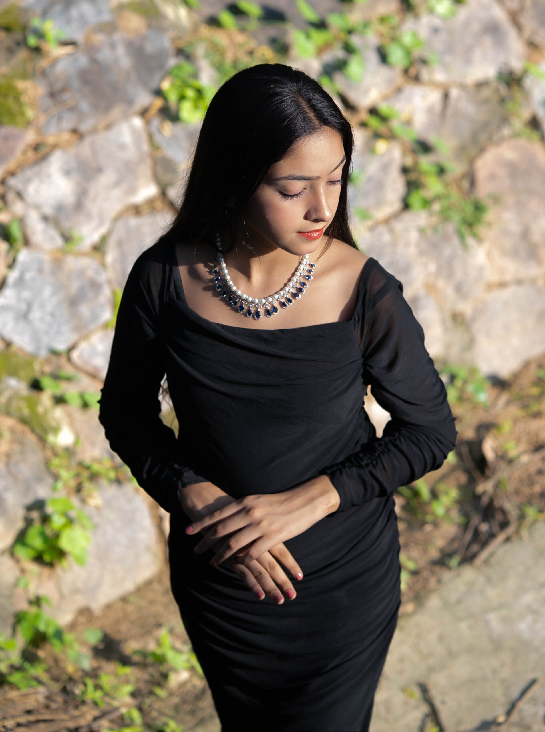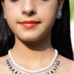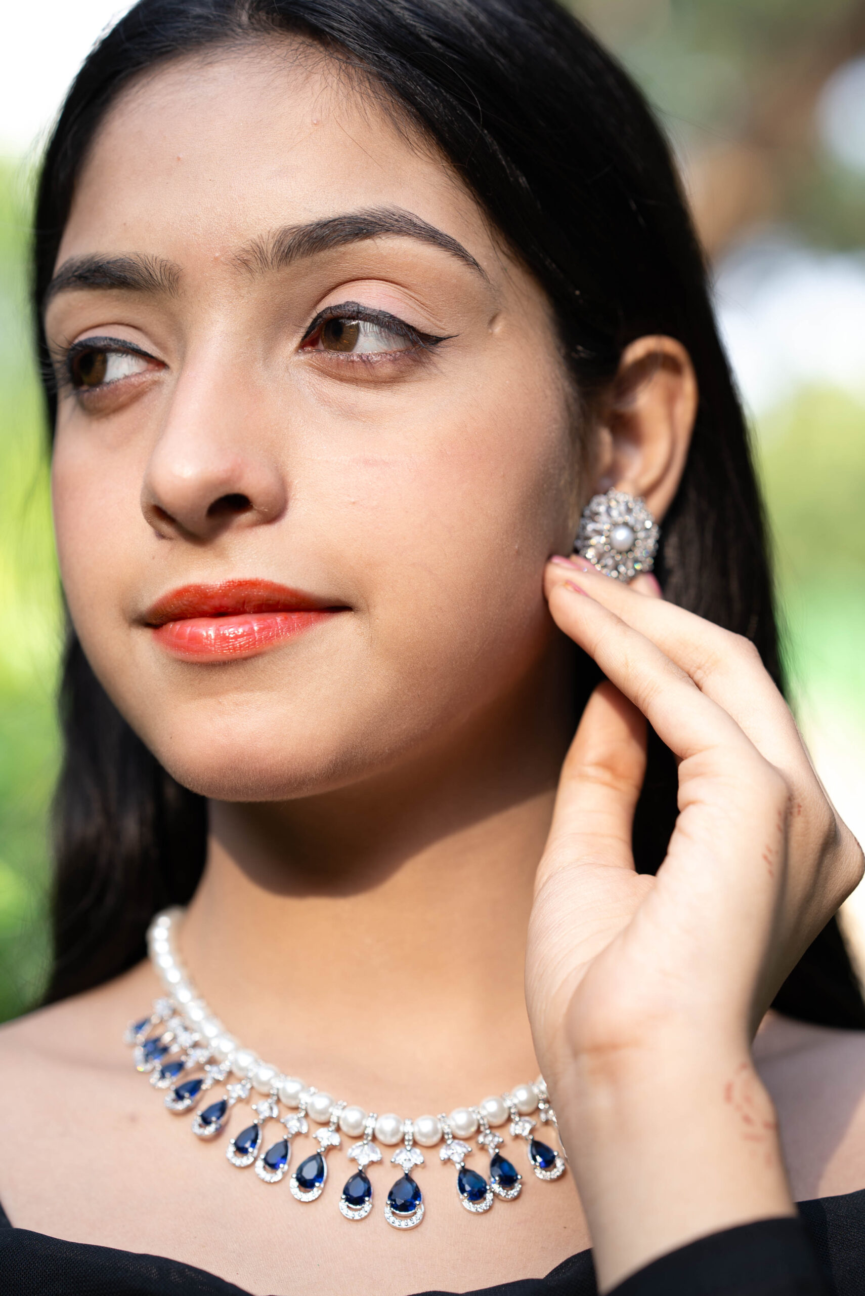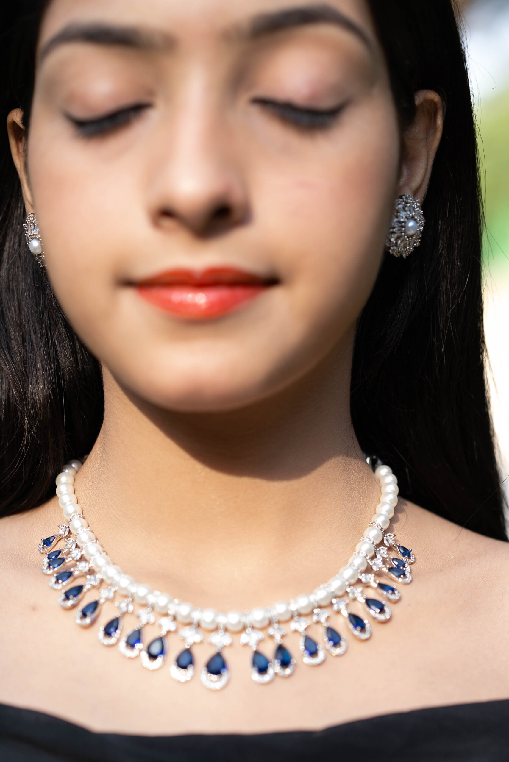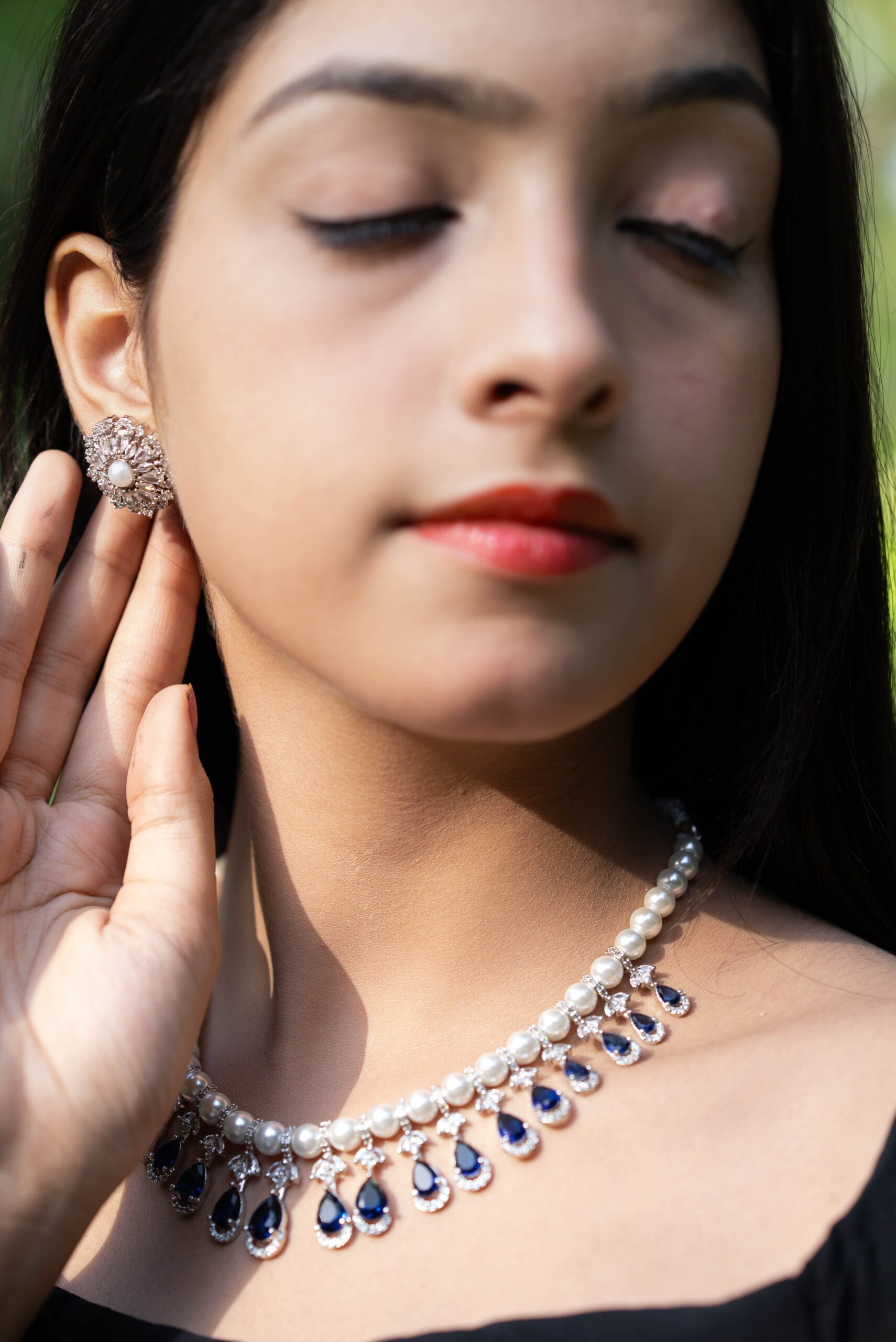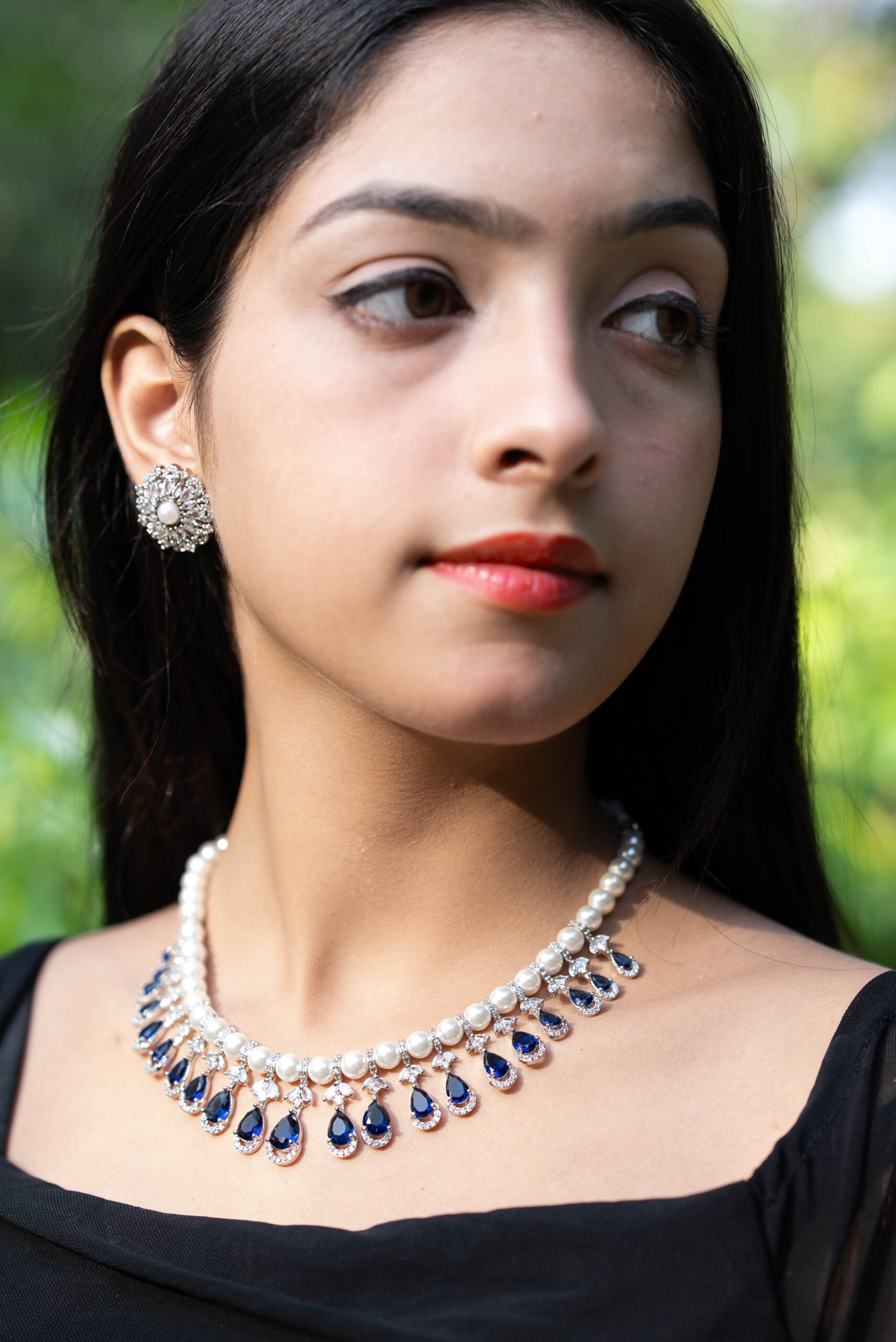 Design: A royal choker-style necklace intricately studded with round pearls, each gracefully alternating with clusters of sparkling American Diamonds. The lower edge is accentuated with teardrop-shaped ruby stones bordered with brilliant crystals, creating a captivating contrast of white and deep red, blue and more hues.